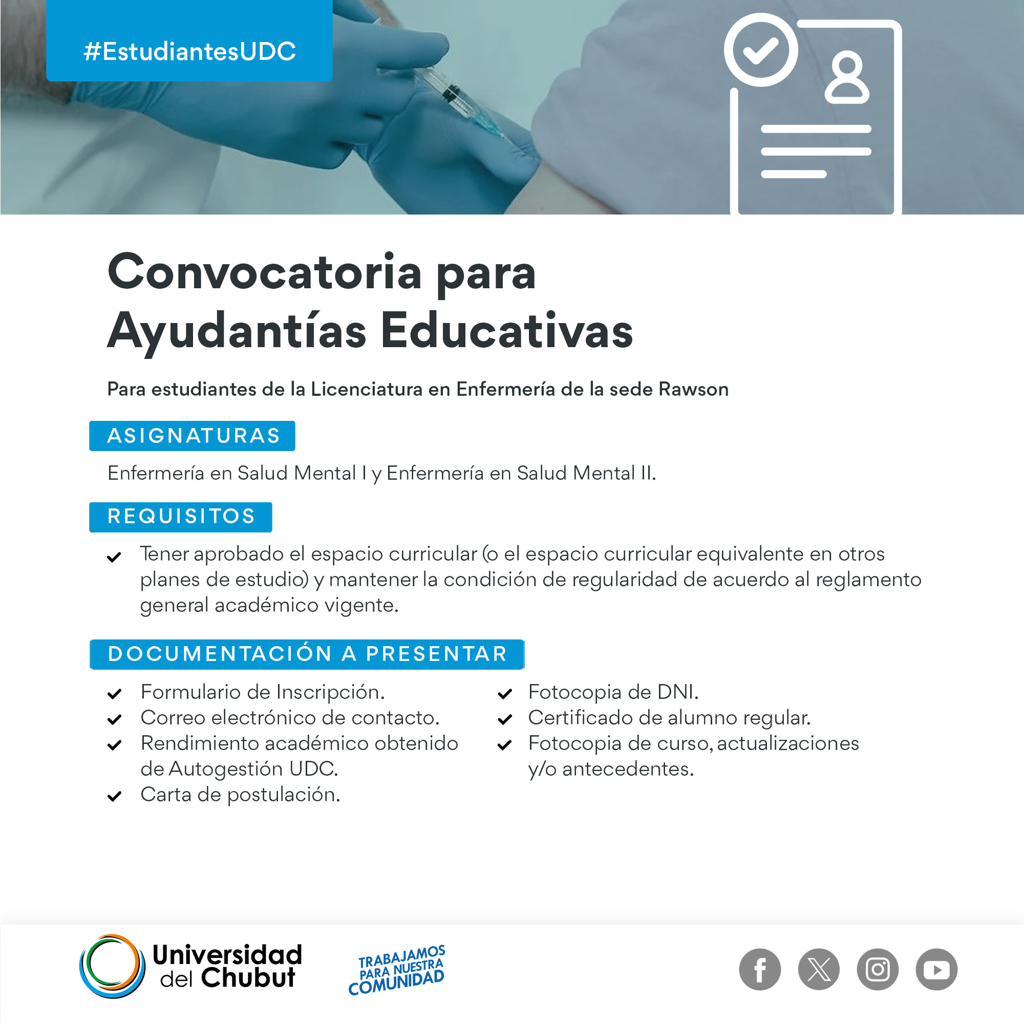 Nuestra Universidad convoca a estudiantes de la Lic. en Enfermería (Ext. Áulica Esquel) para inscribirse como ayudantes en las asignaturas detalladas más abajo.