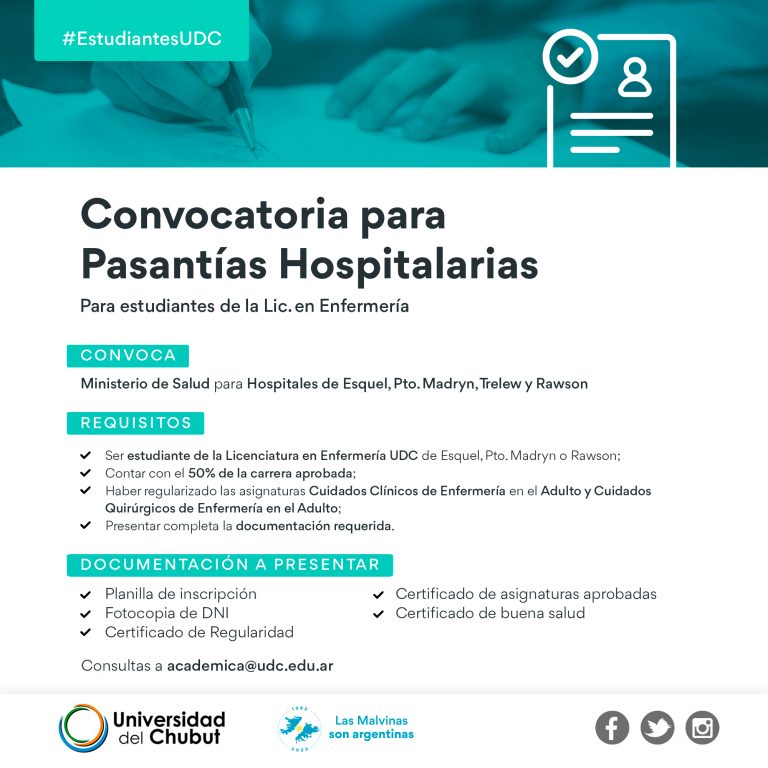 Se buscan estudiantes avanzados de la Lic. en Enfermería UDC de Esquel, Pto. Madryn y Rawson para cubrir pasantías en Hospitales de Esquel, Pto. Madryn, Trelew y Rawson.