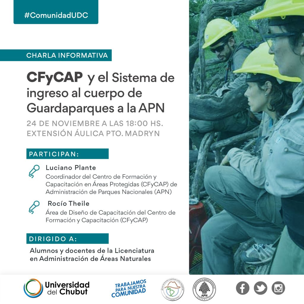 Tras realizar una reunión con autoridades para conversar sobre líneas de articulación entre ambas Instituciones, se realizará a las 18:00 horas una charla dirigida a docentes y estudiantes de La Licenciatura en Administración de Áreas Naturales LAAN sobre las actividades que realizan en el CFyCAP y el sistema de ingreso al cuerpo de Guardaparques a la APN.