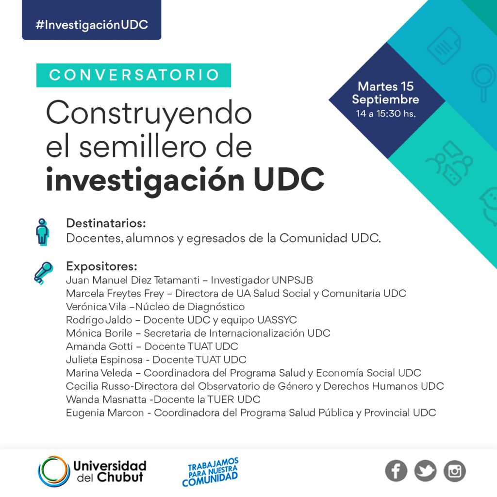 Conversatorio con el objetivo de informar a la comunidad UDC sobre los proyectos de investigación que están en marcha e invitarlos a formar parte con propuestas acordes, desde la estrategia de semillero de investigación donde el investigador (estudiante, semilla, auxiliar de investigación) aprende a aprender, aprende a investigar y descubre o desarrolla el conocimiento.