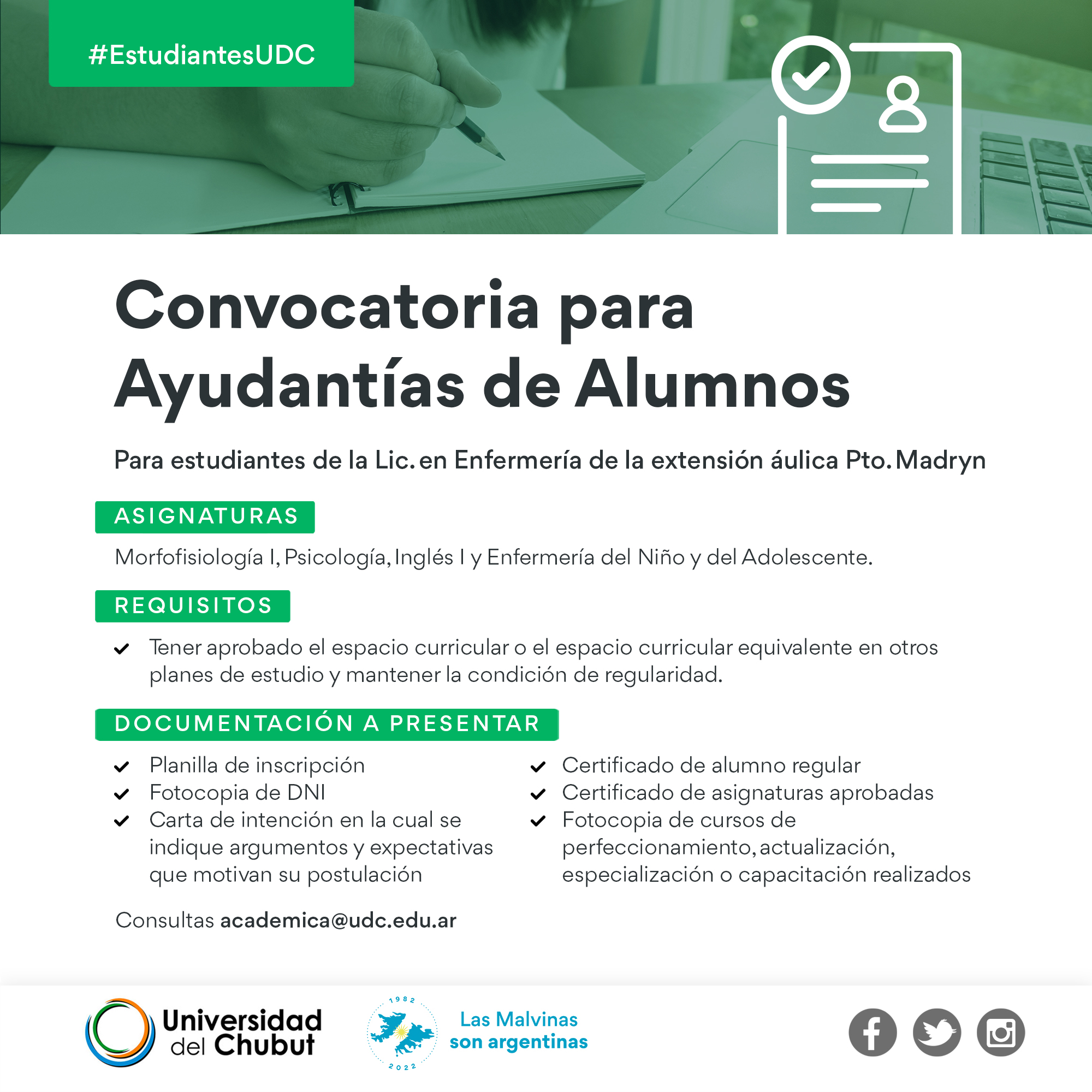 Se convoca a estudiantes de la Lic. en Enfermería (Ext. Áulica de Pto. Madryn) para realizar ayudantías en las asignaturas Morfofisiología I, Psicología, Inglés I y Enfermería del Niño y del Adolescente.