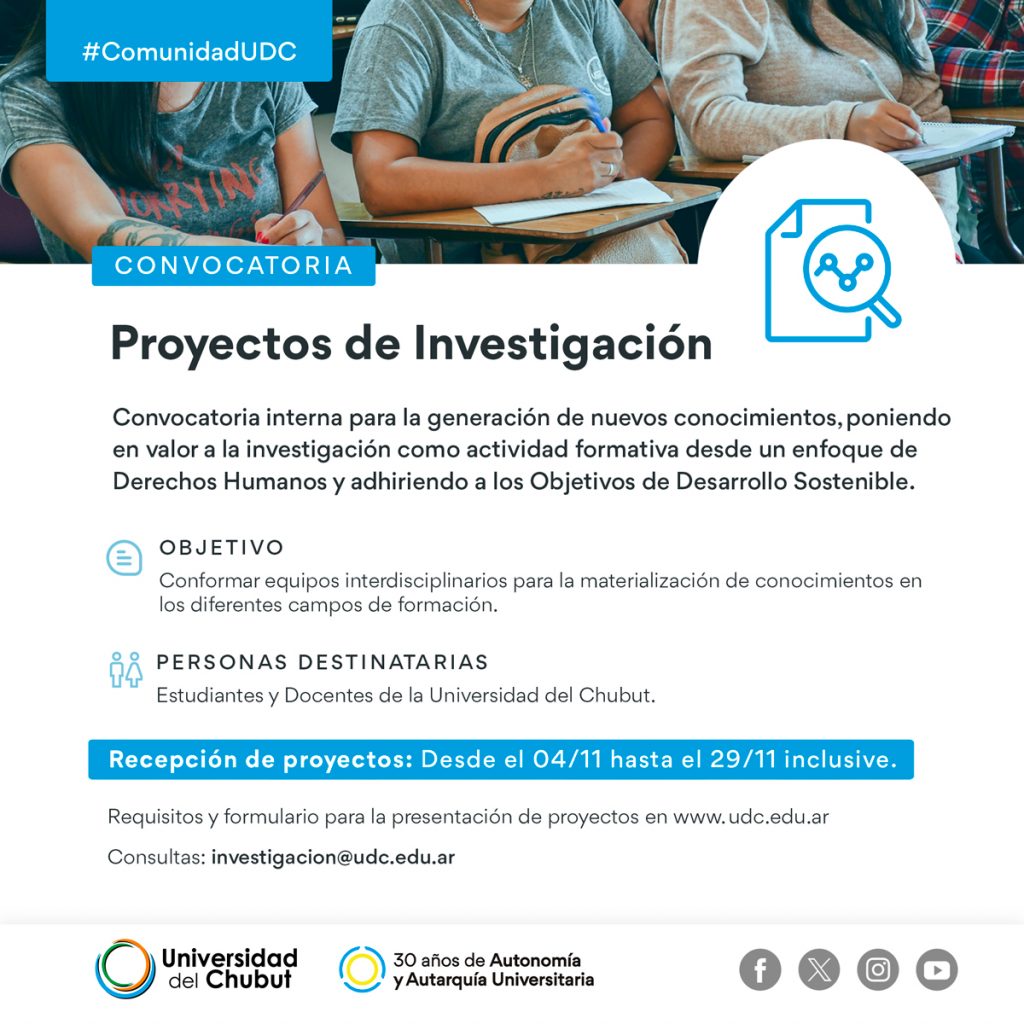 Desde la Coordinación de Investigación anunciamos la apertura de esta Convocatoria Interna destinada a docentes de la UDC que tengan interés en presentar proyectos de investigacion aptos para ser financiados dentro de las líneas de trabajo prioritarias de la Universidad del Chubut.
