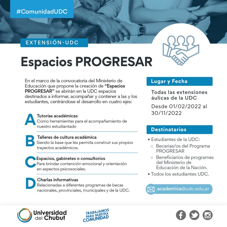 La UDC convoca a profesionales para integrar el “Proyecto Espacios PROGRESAR”, en las sedes de Rawson, Puerto Madryn y Esquel.