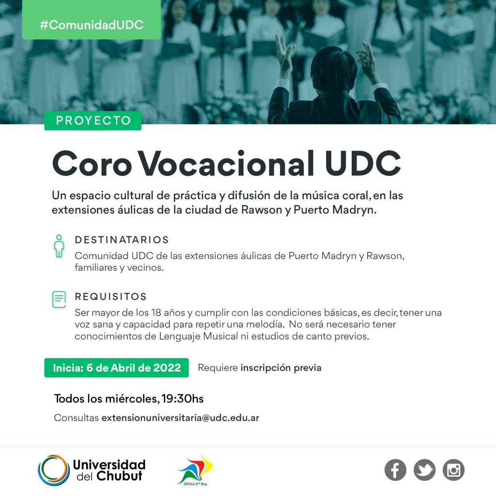 El “Coro UDC” tiene como objetivo principal introducir a los estudiantes, docentes y no docentes, en la práctica de esta actividad artística generando un nuevo espacio para el desarrollo personal de los participantes. El Coro de la Universidad de Chubut es una propuesta musical abierta a toda la comunidad de Trelew, Gaiman, Puerto Madryn y Rawson. Se proyectará la formación de un elenco coral en cada una de las localidades mencionadas.