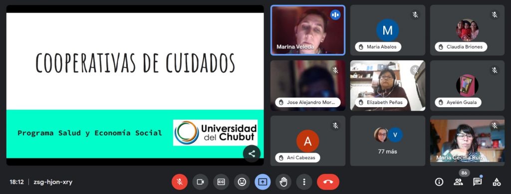 El Encuentro virtual tuvo como objetivo fortalecer los contenidos vinculados al cooperativismo de cuidados. En este sentido, el equipo de la Incubadora de Cooperativas Sociales de la Universidad del Chubut, en el marco del Programa Salud y Economía Social, brindó una charla donde se pudo profundizar en el potencial de desarrollar el trabajo de cuidados desde una empresa cooperativa.