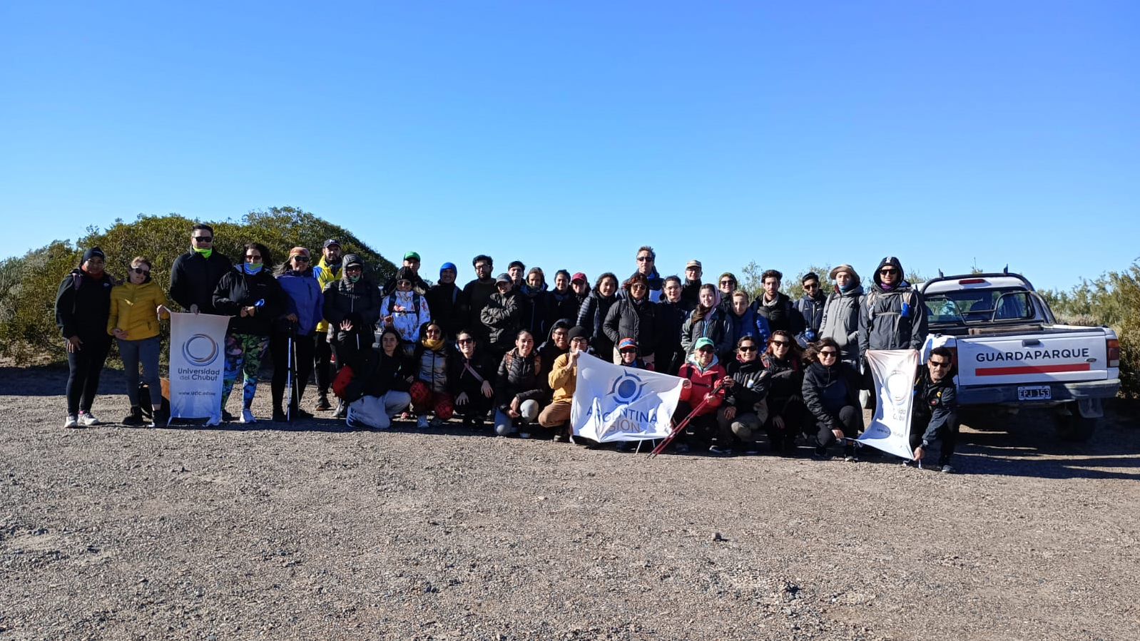 Agradecemos, desde nuestra institución a la Agencia de Turismo Argentina Visión de la ciudad de Puerto Madryn, quienes han colaborado con el transporte para acercar a los/as participantes hasta el lugar de partida.