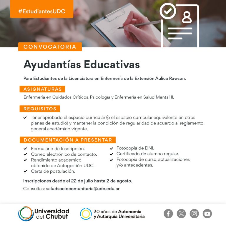 Nuestra Universidad convoca a estudiantes de la Lic. en Enfermería (Sede Rawson) para inscribirse como ayudantes en las asignaturas detalladas más abajo.