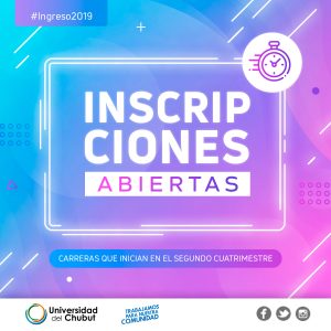 La Universidad del Chubut (UDC) inicia el segundo período de inscripción para ciclo 2019, que tendrá lugar del 15 de abril al 14 de junio para las carreras cuyas cursadas comienzan en el segundo cuatrimestre.