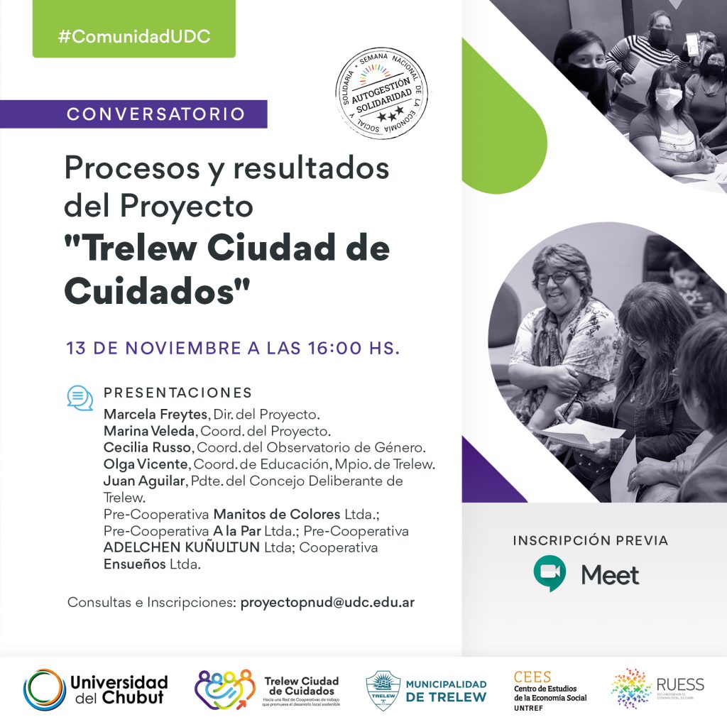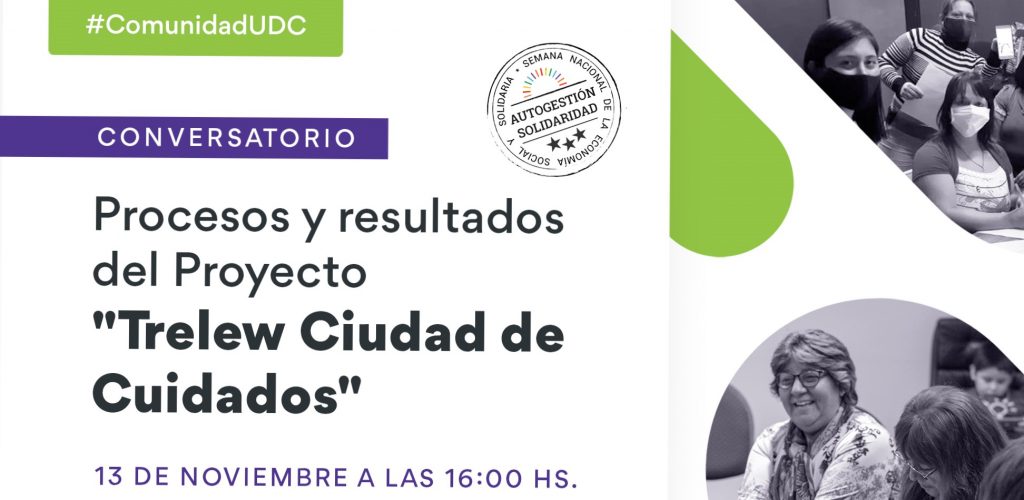 La Universidad del Chubut, a través del Programa Salud y Economía Social, junto a la Municipalidad de Trelew y con colaboración del Centro de Estudios de la Economía Social de la Universidad Nacional de Tres de Febrero, realizarán este viernes 13 a partir de las 16 horas, el conversatorio “Procesos y resultados del proyecto Trelew Ciudad de Cuidados”, en el marco de la Semana de la Economía Social y Solidaria que realiza la RUESS.