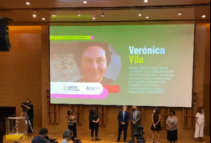 En ese marco, María Verónica Vila docente e investigadora de la Universidad del Chubut fue reconocida por su trabajo en la investigación del coronavirus en la región: Salud mental en las/los trabajadores de servicios esenciales y población en situación de vulnerabilidad psicosocial.
