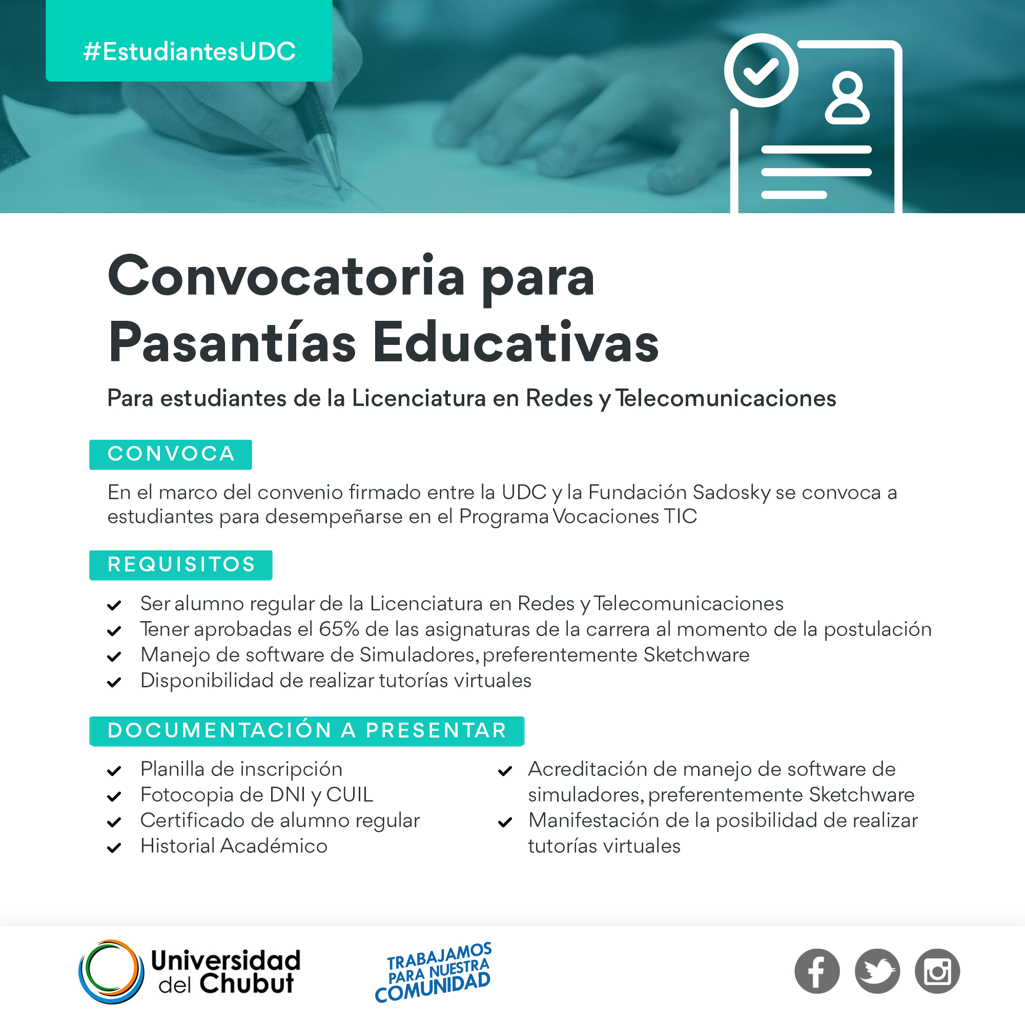 Para desempeñarse en el Programa Vocaciones TIC en el marco del convenio firmado con nuestra Universidad. Se trata de una pasantía por el término de seis meses.