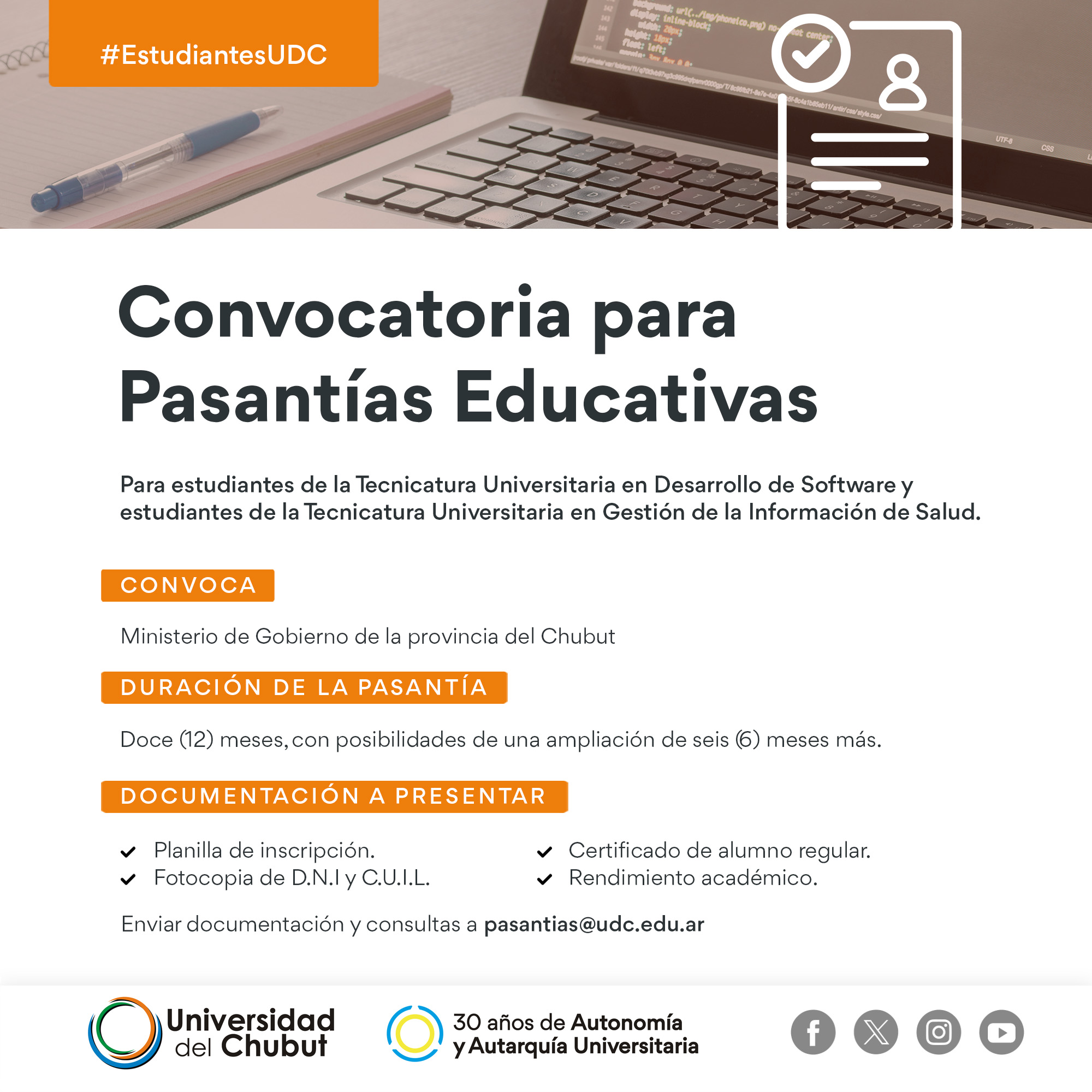La Universidad del Chubut convoca a seis (6) estudiantes de la carrera Tecnicatura en Gestión de la Información en Salud y dos (2) estudiantes de la Tecnicatura Universitaria en Desarrollo de Software para incorporar pasantes en el Ministerio de Gobierno de la provincia del Chubut.