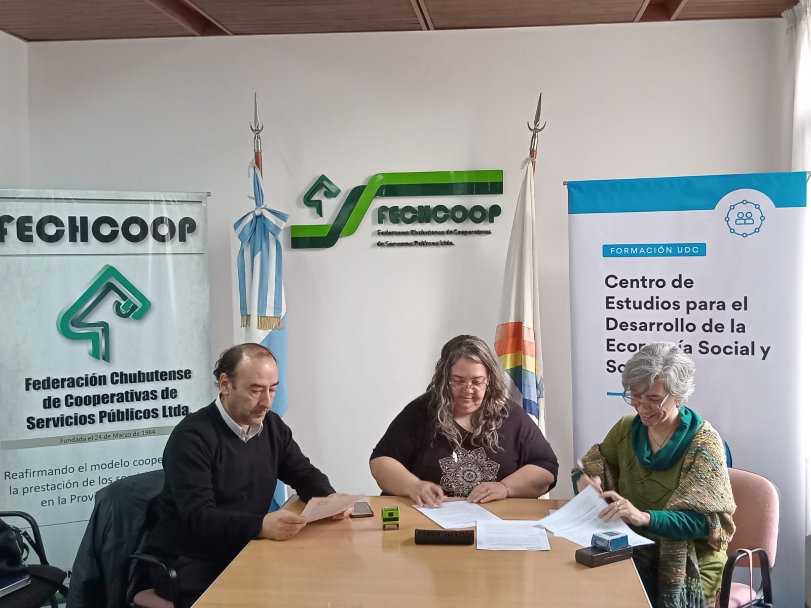Días pasados la Rectora de la Universidad del Chubut, Dra. Marcela Freytes, la Presidenta, Valeria Lewis, y el Secretario, Fernando Javier Monila, de la Federación Chubutense de Cooperativas de Servicios Públicos de la provincia de Chubut (FECHCOOP) firmaron un convenio marco de colaboración.