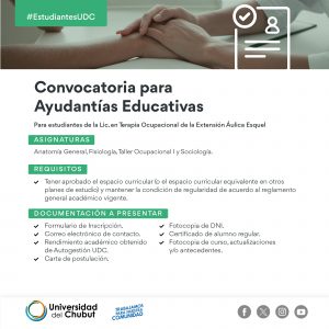 Te convocamos como Ayudante para Terapia Ocupacional en Esquel 6 febrero, 2024 No hay comentarios _________________________________Seguir leyendo »