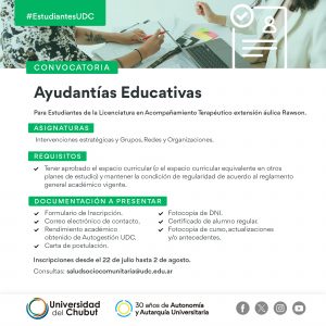 Buscamos postulantes para Ayudantías en Acompañamiento Terapéutico (Rawson/Sarmiento) 18 agosto, 2023 2 comentarios _________________________________Seguir leyendo »