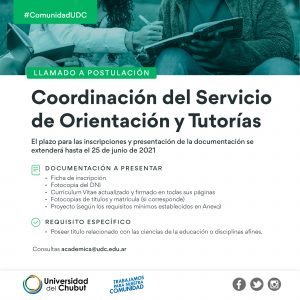 La UDC convoca a docentes para cubrir el puesto en: Puesto: Inscripción cerrada Ver resultado del llamado Documentación a presentar Requisitos específicos Requisitos mínimos del proyecto de coordinación: Los postulantes