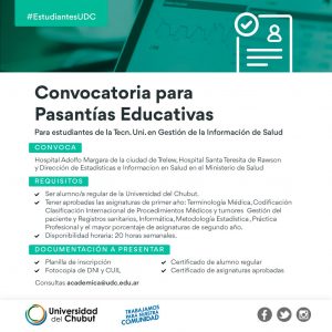 Buscamos Pasantes para Hospitales en Trelew y Rawson, y para el Ministerio de Salud, Rawson – TUGIS 31 marzo, 2021 No hay comentarios _________________________________Seguir leyendo »