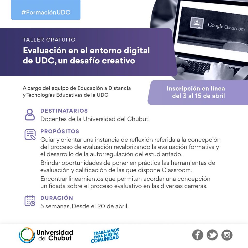 Las clases virtuales estarán a cargo del equipo de Educación a Distancia y Tecnologías Educativas de la Universidad del Chubut, y los participantes recibirán certificación de la UDC por aprobar el taller.