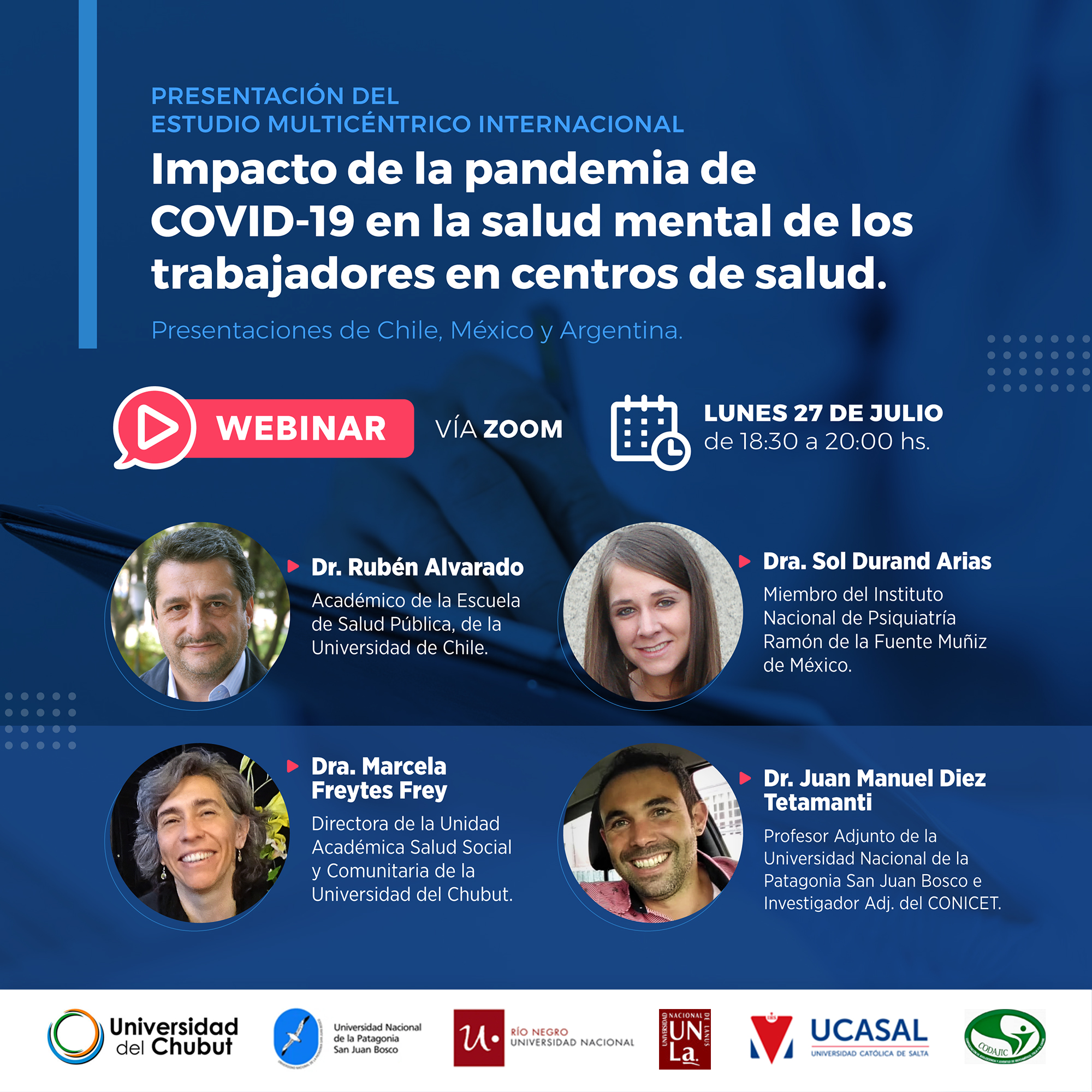 La Universidad Nacional de la Patagonia San Juan Bosco y la Universidad del Chubut, invitan a acompañar a los científicos Dr. Juan Manuel Diez Tetamanti (UNPSJB-CONICET) y Dra. Marcela Freytes Frey, (UDC) quienes representarán a la Argentina en el webinar internacional para la presentación del “Impacto de la pandemia de COVID-19 en la salud mental de los trabajadores en centros de salud. Estudio internacional multicéntrico”.